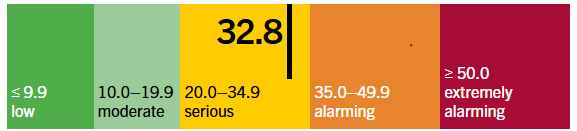 In the 2025 Global Hunger Index, Nigeria ranks 115th outof 123 countrieswith sufficient data to calculate 2025 GHI scores. With a score of 32.8 inthe 2025 Global Hunger Index, Nigeria has a level of hunger that is serious.This GHI Score is based on the values of four component indicators:
